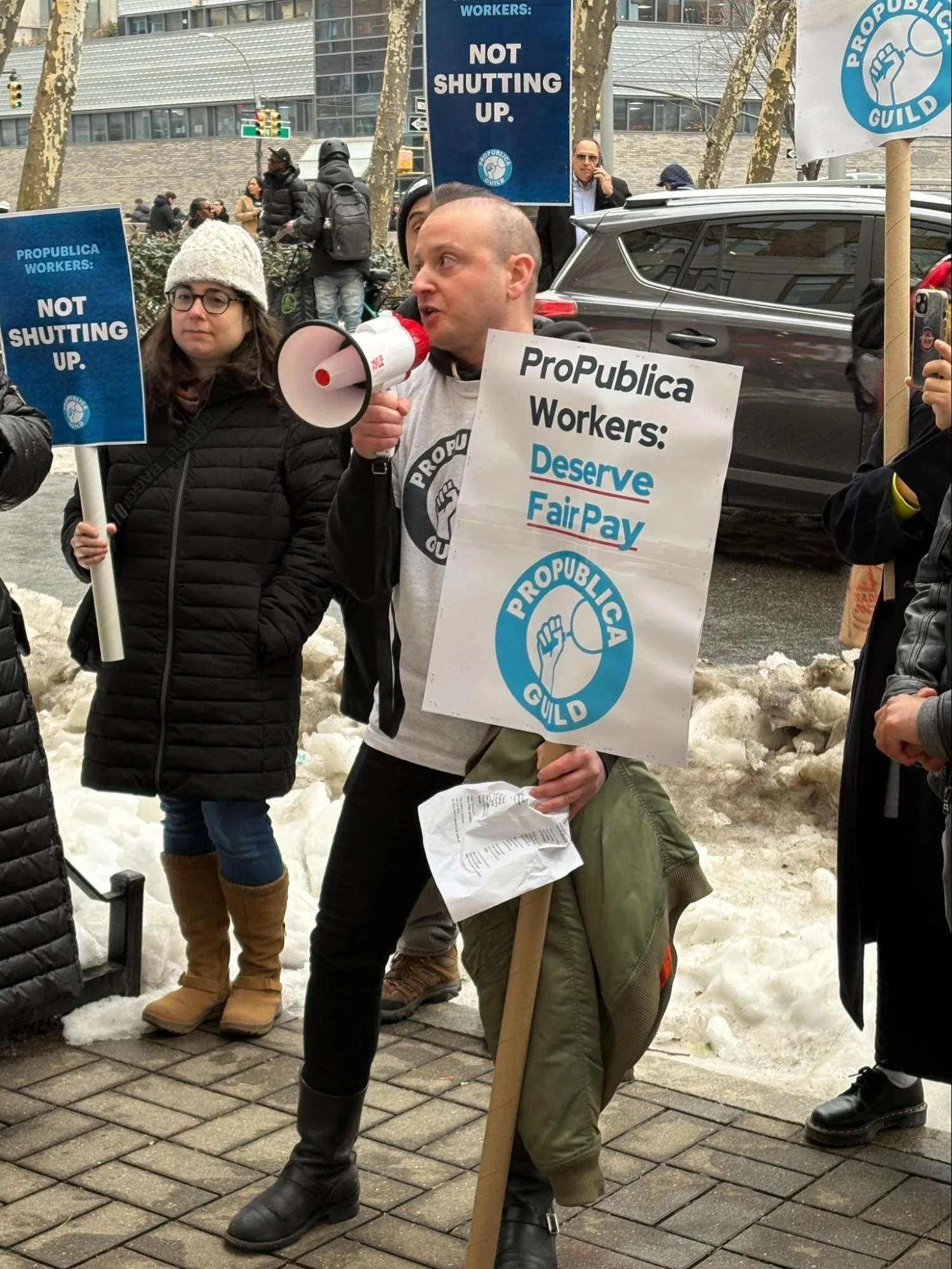 “I’ve spent my career covering protests. Last week, I stood on a picket line for the first time,” said Katie Campbell, a ProPublica Guild member and video journalist. “I was nervous at first. Then, I felt proud — proud to stand with my colleagues for fair pay, Just Cause protections and to not be replaced by AI. We’re not asking for anything extraordinary. We’re asking for the basic security that allows us to do our jobs well. That’s good for journalists and good for the public we serve.”